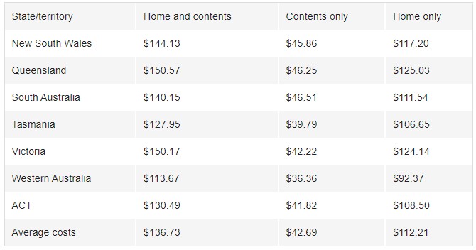 Comparison website finder.com.au analysis shows the average home and contents policy – to cover a house worth $500,000 and contents valued at $100,000 – is $136.73 a month.